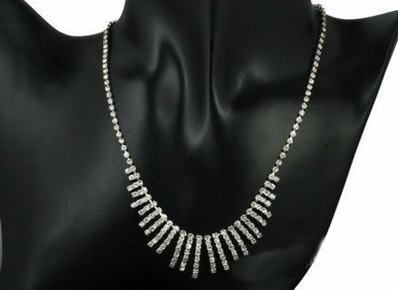 This exquisite set features shimmering rhinestones throughout, including the multi-faceted chain, creating a chic and modern look. Designed to complement any colour wedding dress or formal gown, the necklace gracefully enhances the neckline, making it a perfect choice for the bride or her bridesmaids.