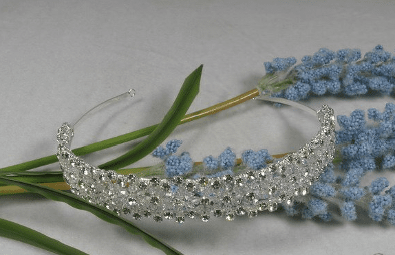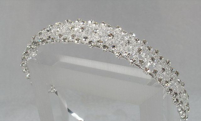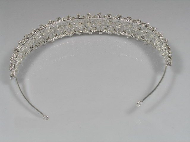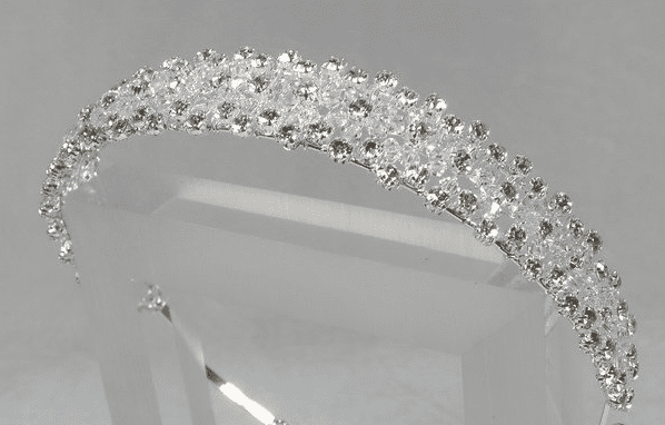 The design of this tiara is simple and spectacular – and what a shine! This silver-toned headpiece is encrusted with rhinestones and crystals.This magnificent tiara measures 14inches in diameter and 1inch at the centre.