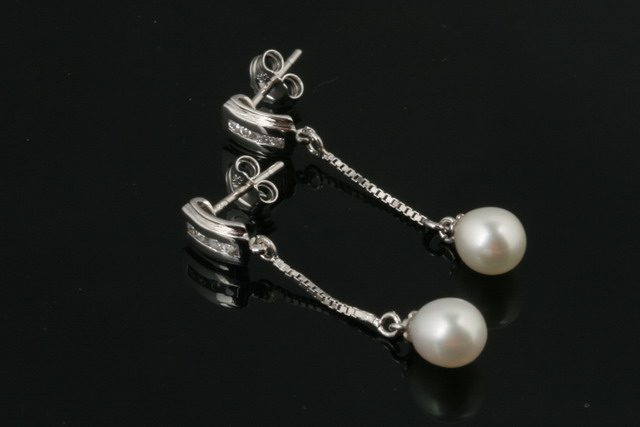 These beautifully designed sterling silver earrings are accented with dazzling zircons and feature a 6–7mm white freshwater oval pearl that delicately dangles from a fine chain. Elegant and refined, they offer just the right touch of sparkle and movement.