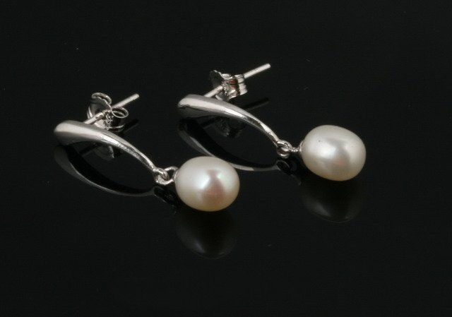 These fashionable earrings in sterling silver have a 6mm-7mm white freshwater oval pearl, that dangles flirtatously. Very classy.