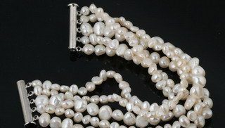 Elegant and classic, this beautiful multi-strand bangle bracelet features five gracefully graduated strands of genuine white freshwater nugget pearls, ranging in size from 4–5mm to 7–8mm. Hand-strung with care and secured with a sleek silver-plated slide tube clasp, this 7.5-inch bracelet offers a timeless design that adds effortless sophistication to any outfit—perfect for both everyday elegance and special occasions.