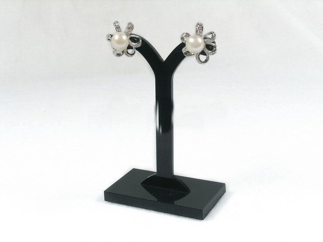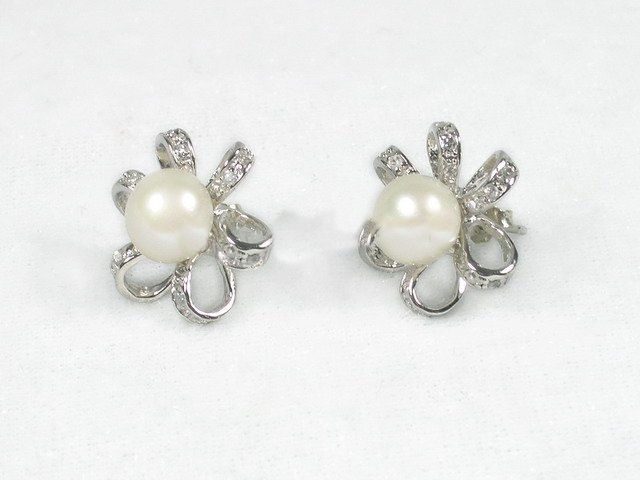 7.5mm-8mm white bread cultured freshwater pearl, which is set in a flower design sterling silver tray. Has shining silver solid studs & pins. Beautiful and stunning.