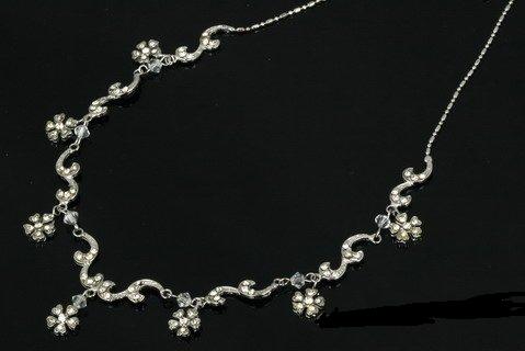 A gorgeous floral bridal necklace made of cubic zirconias. The center drop is 1 inch long. This necklace is delicate and stunning. The necklace measures 16-18 inches long and can be adjusted with the extender chain for just the right fit. The necklace joins with a secure lobster claw clasp. Beautiful. Gift box included.
