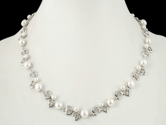 This stunning pearl jewellery set brings timeless elegance and sparkle to any occasion. It features an 18-inch classic white pearl necklace, a 7.5-inch matching bracelet, and coordinating dangle earrings—all beautifully crafted with 7–7.5mm and 4.5–5mm white pearls arranged in a romantic heart-shaped pattern.