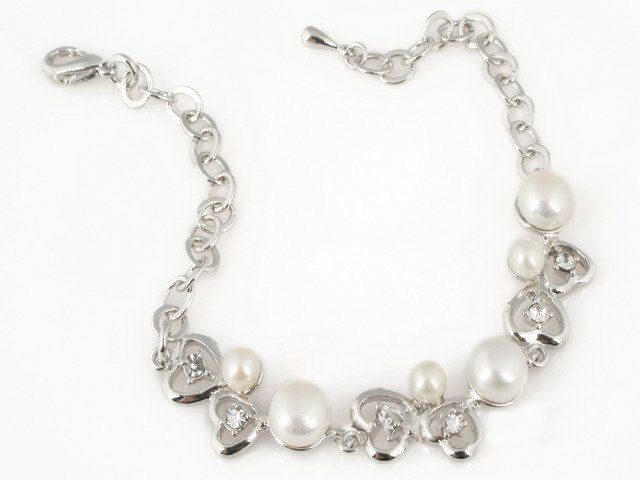 This gorgeous pearl jewellery set is stunning. The set features an 18-inch classic white pearl necklace, 7.5-inch white pearl bracelet and matching white pearl dangle earrings. The set features 7mm-7.5mm & 4.5mm-5mm white bread pearls that are set in a gorgeous heart shaped pattern. Dazzles with brilliant white CZs! All metal is silver plated.