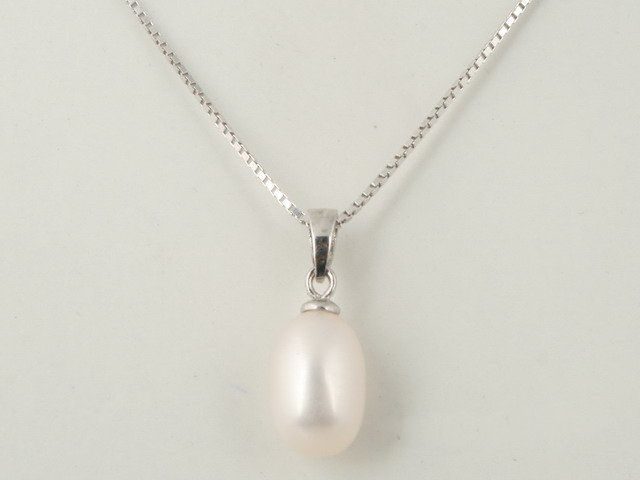 This classic sterling silver pearl pendant, features a white 8-9mm freshwater oval pearl. Includes a 41cm sterling silver box chain. Gift box included.