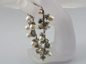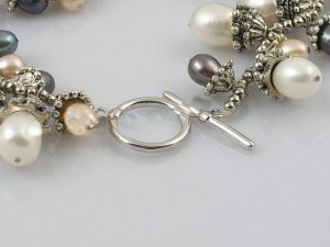 This handcrafted rice shape pearl bracelet is studded with 8-9mm rice white pearls and 5-6mm rice pink and black pearls with silver fittings at intervals. Has an sterling silver toggle clasp. The length is 19cms. Its elegance charms everyone.