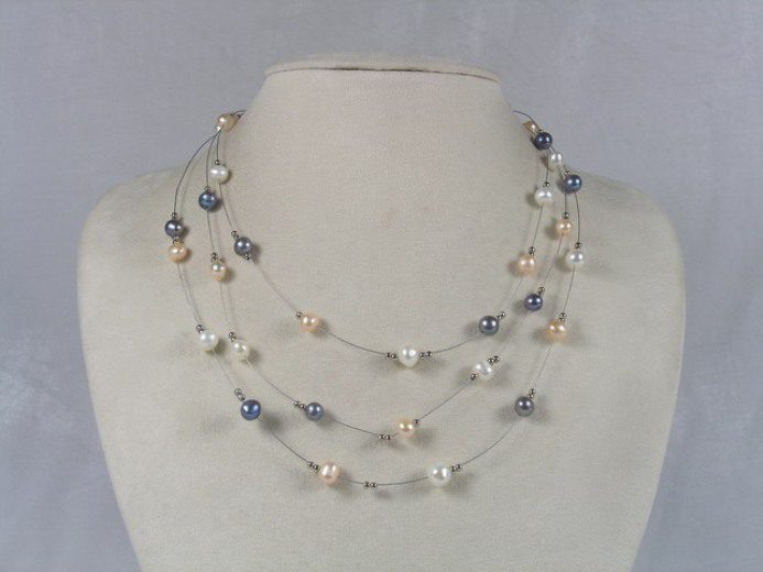 This enchanting necklace features 6–7mm multi-colored potato-shaped freshwater pearls linked by a delicate metal chain. Silver beads are artfully placed at intervals, some free to move, adding a playful sparkle to the design. Measuring 43.2cm in length and secured with a sterling silver clasp, it’s a versatile and eye-catching accessory.