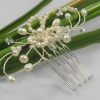This stunning hand crafted bridal comb, features a flower design that is adorned by 3-4mm white potato pearls, 4-5mm white rice pearls and crystals. This elegant bridal comb measures 62mm in length and 50mm wide.