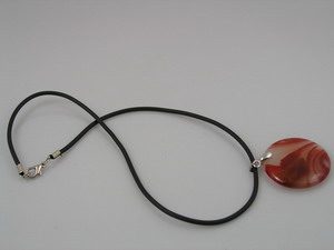 This striking pendant features a 35mm coin-shaped red agate crystal suspended from a chic black leather-look chain. A perfect accessory for adding a bold, contemporary touch to any outfit.