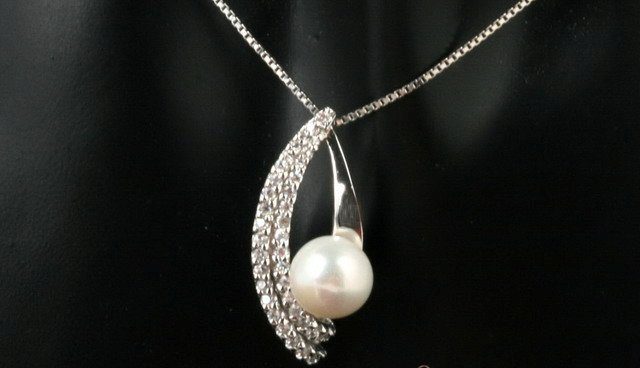 This stunning pendant showcases an 8–8.5mm white freshwater button (bread) pearl set in a designer sterling silver setting adorned with sparkling cubic zirconias. Simply gorgeous and perfect for adding a touch of romance to any outfit.